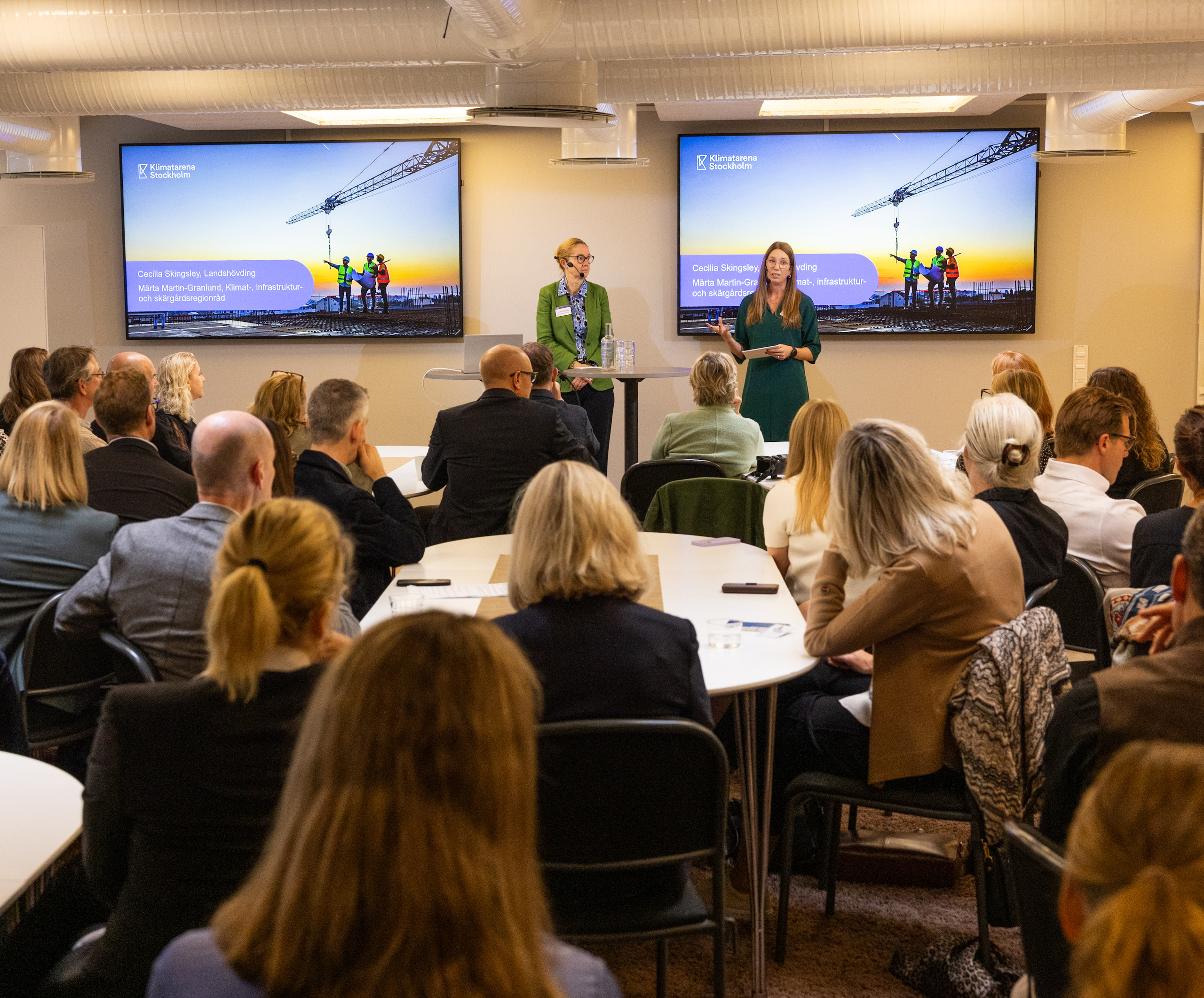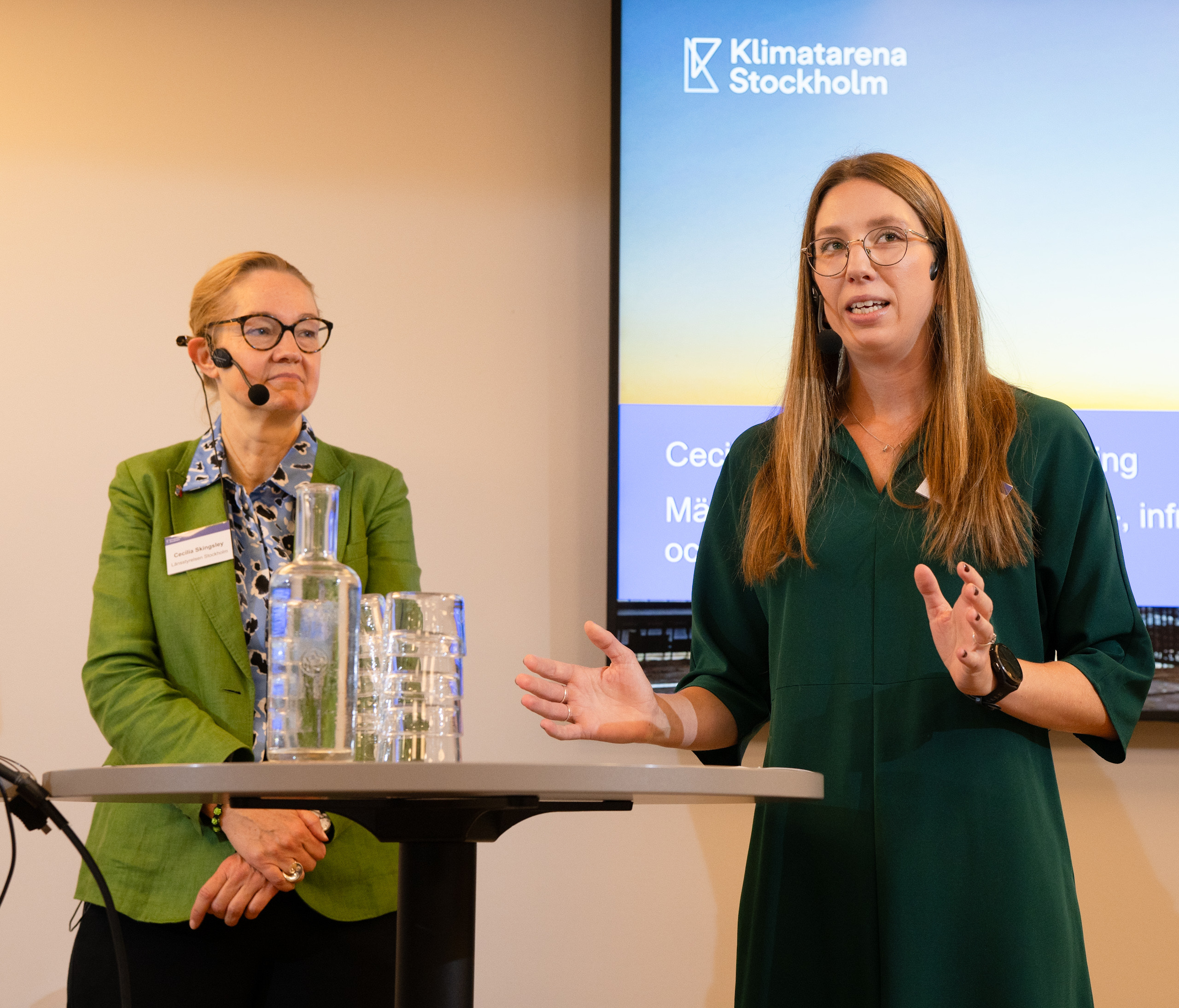Alva Herdevall-Rydell och Louise Arbin, processledare för Klimatarena Stockholm, presenterade plattformens arbete och resultat från den senaste uppföljningen av klimatlöftet. Den visar bland annat att bristande krav och styrning från beställare är det största hindret för att nå klimatmålen i branschen. Här kan du läsa mer och ta del av hela uppföljningen av 2024.