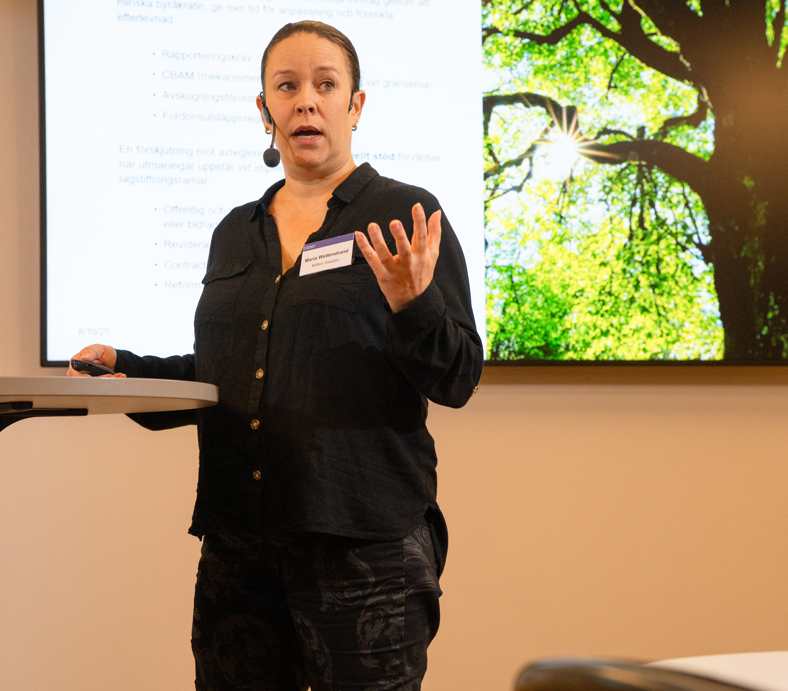 Hur viktigt det är att hålla fast vid ambitionerna i omställningen belystes av Maria Wetterstrand, senior advisor EU Public Affairs and Sustainability på Miltton Sweden. Hon gav en översikt av utvecklingen med fokus på EU och framhöll särskilt att klimatarbetet är ett sätt att minska risker för företag.